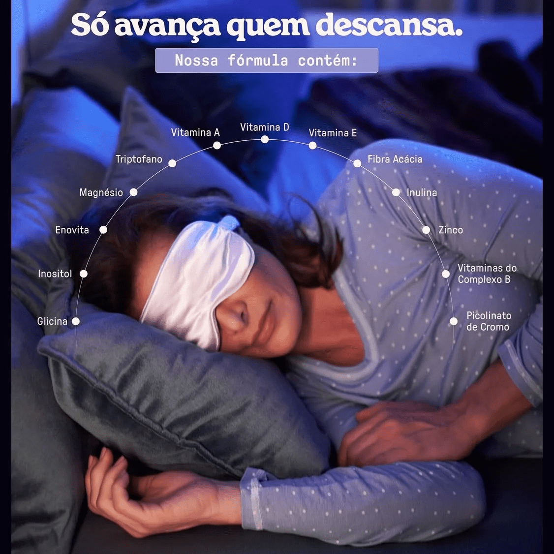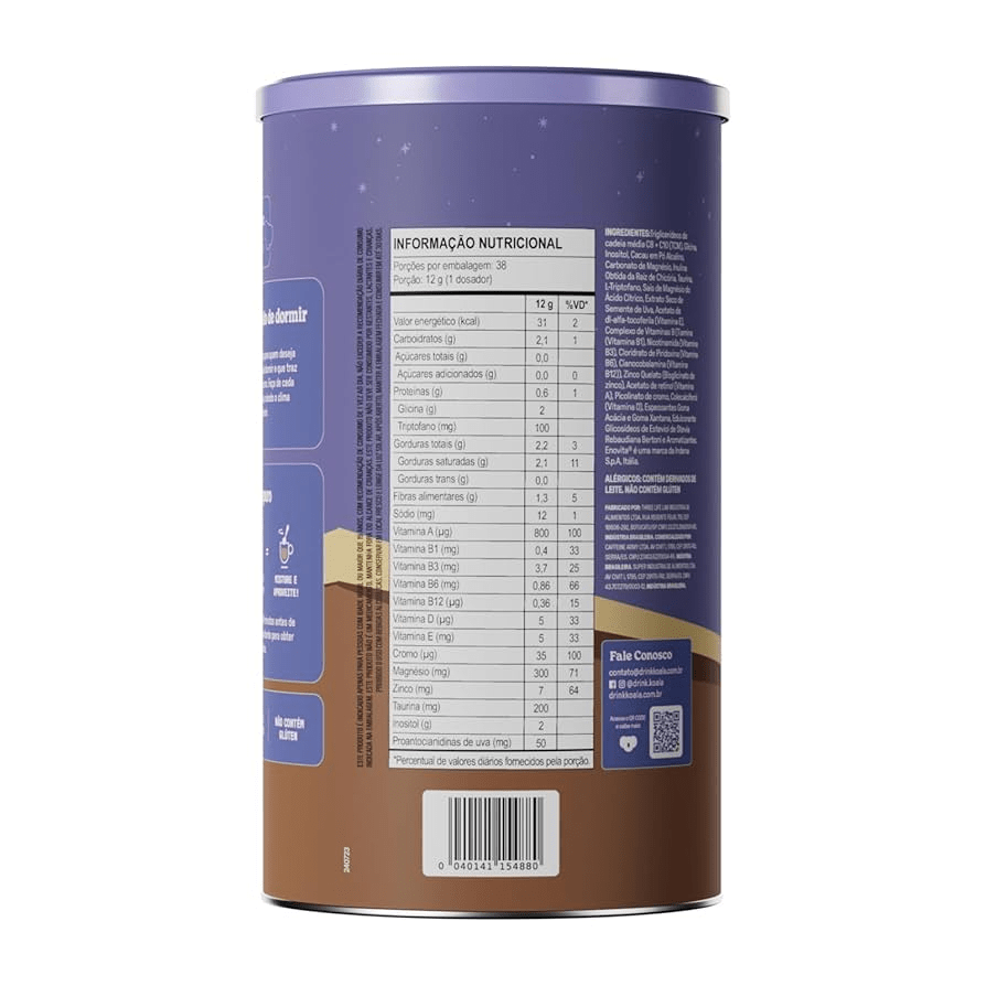 INGREDIENTES: Triglicerídeos de cadeia média C8 + C10 (TCM), glicina, inositol (mio-inositol), cacau em pó alcalino, carbonato de magnésio, inulina obtida da raiz de chicória, taurina, L-triptofano, sais de magnésio do ácido cítrico, extrato seco de semente de uva, acetato de DL-alfa-tocoferila (vitamina E), complexo de vitaminas B (tiamina (vitamina B1), nicotinamida (vitamina B3), piridoxina (vitamina B6), cianocobalamina (vitamina B12)), bisglicinato de zinco (zinco quelato), acetato de retinol (vitamina A), picolinato de cromo, vitamina D3 (colecalciferol), espessantes: goma acácia e goma xantana, edulcorante glicosídeos de esteviol de Stevia rebaudiana Bertoni e aromatizantes.