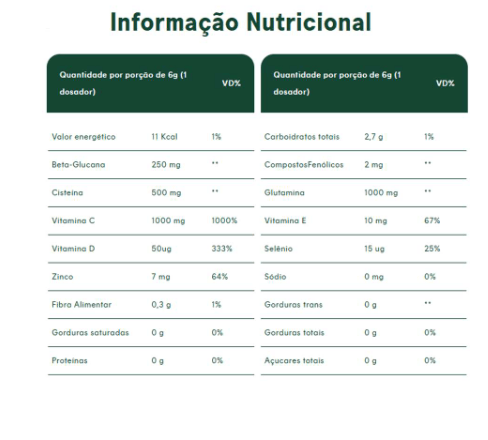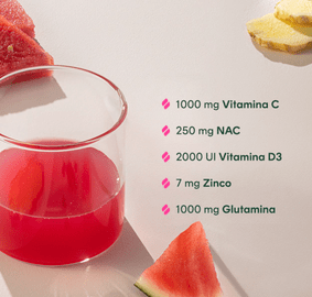 Melancia - Vinagre de maçã em pó, L-Glutamina, Ácido ascórbico (Vitamina C), Melancia em pó, Glicina, Polpa de limão em pó, Beta-glucana de levedura (Saccharomyces cerevisiae), N-Acetil L-Cisteína, Beterraba em pó, Gengibre em pó, Extrato de Própolis, Pimenta Preta em pó, Acetato de DL-alfa-tocoferol (Vitamina E), Bisglicinato de Zinco (Zinco), Vitamina D3 (Colecalciferol), Selenito de sódio (Selênio), Acidulante Ácido Cítrico, Aromatizantes, Edulcorante Glicosídeos de Esteviol de Stevia rebaudiana Bertoni e Antiumectante Dióxido de Silício.