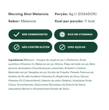 O Morning Shot é um shot matinal para suplementar a alimentação ao longo do dia. Sua fórmula é repleta de vitaminas, nutrientes e minerais, selecionados por profissionais de saúde. A vitamina C, a vitamina D, o selênio e o zinco auxiliam no funcionamento do sistema imune. Além deles, o Morning Shot contém outros ativos com diversos benefícios, são eles: vitamina E, glutamina, NAC, vinagre de maçã em pó, beta glucana, extrato de própolis, glicina, gengibre, pimenta preta e limão em pó.
