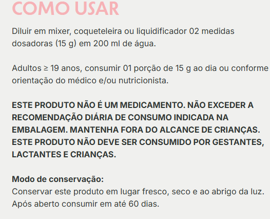 ESTE PRODUTO NÃO É UM MEDICAMENTO. NÃO EXCEDER A RECOMENDAÇÃO DIÁRIA DE CONSUMO INDICADA NA EMBALAGEM. MANTENHA FORA DO ALCANCE DE CRIANÇAS. ESTE PRODUTO NÃO DEVE SER CONSUMIDO POR GESTANTES, LACTANTES E CRIANÇAS.