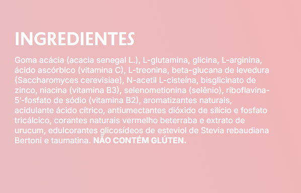 Goma acácia (acacia senegal L.), L-glutamina, glicina, L-arginina, ácido ascórbico (vitamina C), L-treonina, beta-glucana de levedura (Saccharomyces cerevisiae), N-acetil L-cisteína, bisglicinato de zinco, niacina (vitamina B3), selenometionina (selênio), riboflavina-5’-fosfato de sódio (vitamina B2), aromatizantes naturais, acidulante ácido cítrico, antiumectantes dióxido de silício e fosfato tricálcico, corantes naturais vermelho beterraba e extrato de urucum, edulcorantes glicosídeos de esteviol de Stevia rebaudiana Bertoni e taumatina. NÃO CONTÉM GLÚTEN.